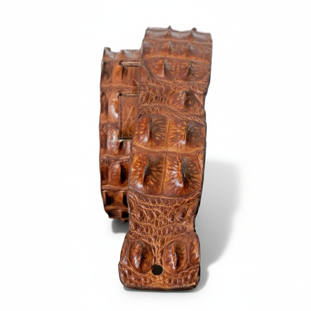 Bring character and premium comfort to the stage with this cognac genuine alligator hornback leather guitar strap. This genuine alligator hide strap isn't just a functional accessory; it's burnished finish ranks you with the stars. Expertly handcrafted, this exceptional strap offers more than just striking aesthetics; it is fully adjustable and features a luxuriously soft New Zealand lambswool inner padding, ensuring comfort during your longest sets.